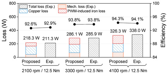 In order to verify the predicted efficiency of the optimized traction motor, a load test was conducted at 2100 rpm through 4100 rpm at 12.5 Nm, which are the main operating points. The experiments were conducted after a state of 30 minutes of continuous driving for temperature equilibrium to exclude the influence of parameter uncertainty. The measured efficiency was compared with the predicted efficiency and simulation results calculated by FEA. The predicted efficiency was calculated using electromagnetic loss predicted from the DNN surrogate model and FEA under each load condition, as well as the predicted mechanical loss from the no-load test. The efficiency was evaluated by considering iron loss with PWM current, and the eddy current loss of the PM was neglected because the PMs were segmented into small pieces. Figure 16 shows the comparison of power loss and efficiency for measured and predicted results. The efficiency predicted using the proposed method differed by up to 0.3%p from the efficiency calculated using FEA. Therefore, it has been demonstrated that the proposed method can be used for the prediction of efficiency instead of using FEA. Consequently, the calculated efficiency using the proposed method was verified, and the reliability of the design optimization could be secured.