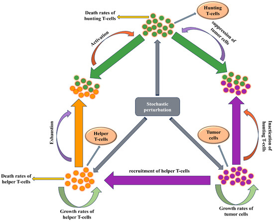 In research on tumor immunodynamics, Kaur [27] employed a Michaelis–Menten kinetic model to elucidate cytokine-mediated dynamic interactions between helper T-cells and tumor cells, demonstrating that the biological threshold of affinity enhancement effectively suppresses tumor proliferation. Based on this framework, Wang [28] introduced stochastic perturbations through Gaussian white noise to quantify microenvironmental fluctuations while delineating the tripartite regulatory network involving tumor cells, hunting T-cells, and helper T-cells (Figure 1). Subsequently, Li [29] advanced this paradigm by establishing the following integrated stochastic immune–oncology model that incorporates both biological noise and periodic variations due to pharmacological interventions: