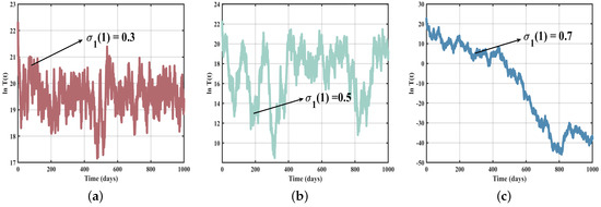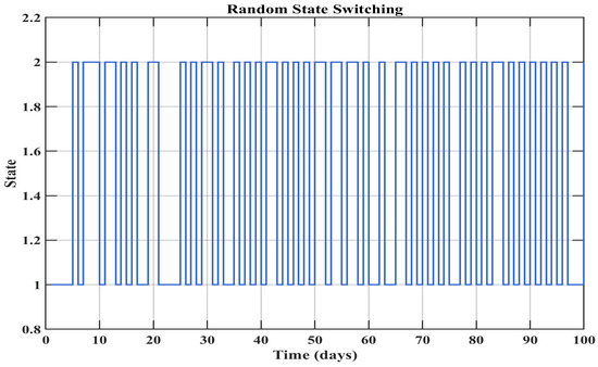 The Milstein high-order method [36] is an efficient and accurate numerical method for solving stochastic differential equations (SDEs). It can transform continuous SDEs into a series of discrete approximations by discretizing the time step, thereby achieving numerical solutions to the original equations. The strengths of the Milstein high-order method lies not only in its ability to enhance the solution accuracy by introducing the second-order term into It’s formula but also in solving various types of SDEs, including linear and nonlinear equations. Particularly, this method is capable to solve SDEs with Markov regime switching. Therefore, we choose to employ this method for the subsequent numerical simulation. The initial conditions are set as