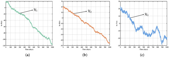Figure 6 explores the long-term dynamics of tumor cells under different values of . Specifically, is chosen as , , and , respectively. Comparing the subplots in Figure 6a–c, it can be observed that as increases from to , the tumor cell clearance effect gradually strengthens. Furthermore, when increases from to , the persistence of tumor cells transitions to extinction. These results demonstrate that environmental disturbances, by increasing noise intensity, can significantly suppress tumor cell growth, with stronger noise showing more pronounced inhibitory effects. This study suggests that appropriately adjusting the intensity of random disturbances is an effective approach to controlling the dynamics of tumor cells, providing new insights and theoretical support for optimizing tumor treatment strategies.