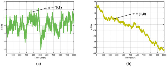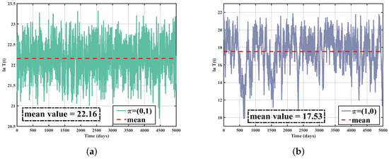 Figure 4a,b show the numerical simulation results of the system (2) under the stationary distributions and , respectively. To comprehensively analyze how switching probabilities influence the average population size of tumor cells, we extend the timescale as much as possible. A longer timescale allows us to observe the long-term trends and stabilization effects. These results are consistent with the analytical conclusions of Theorem 3. Furthermore, we observe that under weak persistence, when the noise intensity increases from 0.2 to 0.5, the number of tumor cells significantly decreases. This phenomenon indicates that higher noise intensity effectively suppresses tumor cell growth, validating the critical role of noise interference in the control of tumor dynamics.