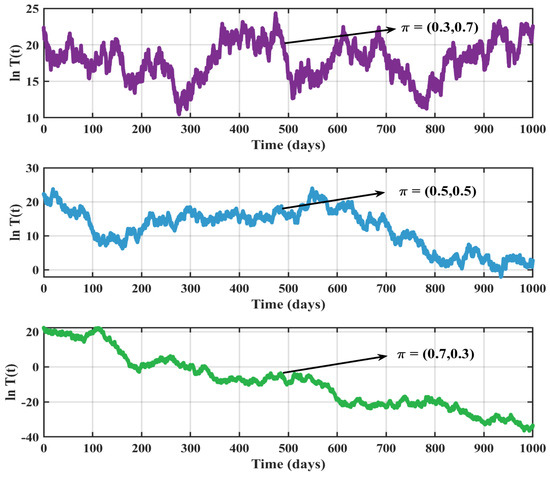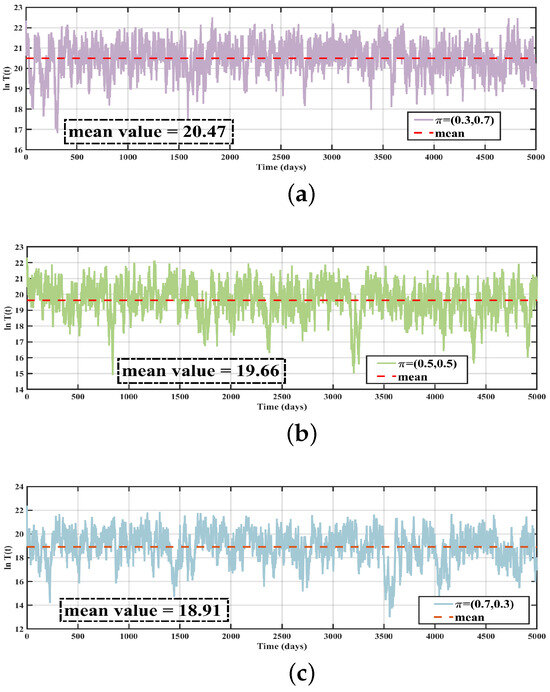 To analyze the impact of state switching on tumor cell dynamics, we set the parameters ; ; ; and . In the subsequent numerical simulations, we study the system’s behavior under different stationary distributions, , of the Markov chain. The varying values of represent different relative dwell times of the system in the two states during the switching process.