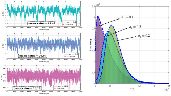 As shown in Figure 9, the left panel demonstrates the trends in the average value of tumor cells for different values of . It can be observed that as increases, the average value of tumor cells exhibits a gradual upward trend. The right panel of Figure 9 depicts the steady-state distribution corresponding to different values of . It reveals that as increases from 0.1 to 0.3, the concentrated range of tumor cell quantity distribution shifts progressively to the right, and the tumor cell count correspondingly increases. These findings reveal the significant influences of the growth factor on the long-term behavior of tumor cells. An increase in promotes tumor cell growth, providing theoretical insights for the further development of tumor treatment strategies.