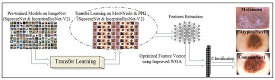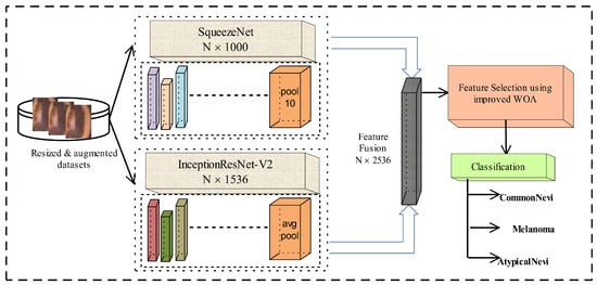 In this article, skin samples are preprocessed and then these preprocessed samples are supplied to pretained versions of SqueezeNet and InceptionResNet-V2 to obtain deep CNN features using the transfer learning approach. Afterward, these obtained feature vectors are serially concatenated. From the fused feature vector, the significant and optimal features are selected with the help of an improved whale optimization algorithm (WOA). Lastly, skin cancer is predicted with the help of machine learning classifiers. The complete framework is presented in Figure 1.