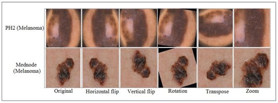 In this study, two publicly available datasets, PH2 and Med-Node, are utilized to evaluate the skin cancer classification framework. Initially, the datasets had variations in the size of samples; thus, all the images of both datasets got resized to . Secondly, the number of images in each class was smaller, so image augmentation was performed. Initially, the Med-Node dataset consisted of two classes. The naevus class was augmented using 4 techniques including horizontal flip, vertical flip, transpose, and zoom while for the melanoma class, one more augmentation technique, including four previous ones, was added called rotation to minimize the class imbalance. The details regarding dataset augmentation on the Med-Node dataset are given in Table 1 while the impact of data augmentation is shown in Figure 2.