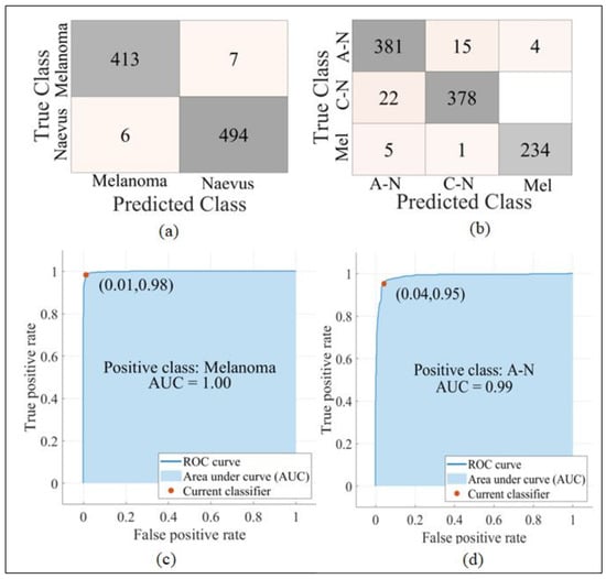 Confusion matrices and ROCs. (a) Confusion matrix of C-SVM on Med-Node dataset. (b) Confusion matrix of C-SVM on PH2 dataset. (c) ROC of C-SVM on Med-Node dataset. (d) ROC of C-SVM on PH2 dataset.