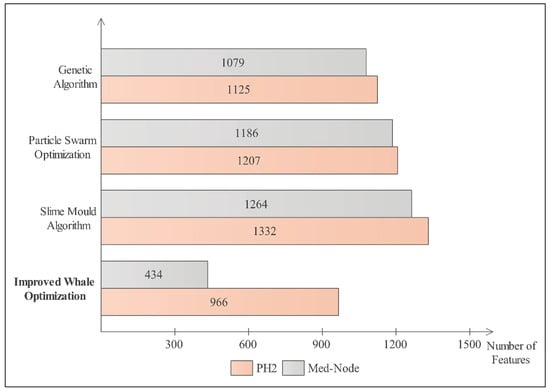 The improved WOA is also compared with some other optimization algorithms including the genetic algorithm [55], particle swarm optimization [56], and the slime mould algorithm [57] to ensure the effectiveness of the improved WOA algorithm. A graph is presented in Figure 5 for a comparison of the number of selected features using different optimization techniques.