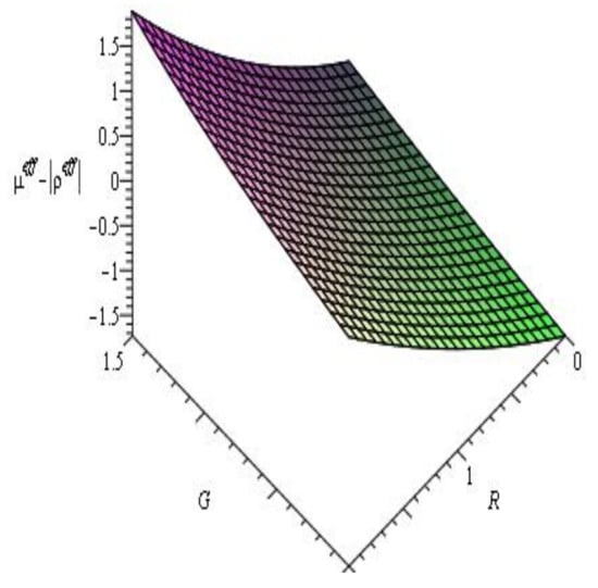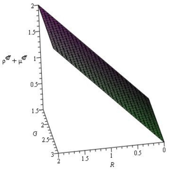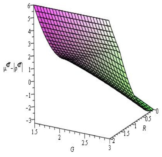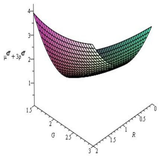 Figure 5 shows that the behavior of the energy density is positive for the ranges of parameters  and . Figure 6 shows the  profile, which also produces a positive value. Therefore, the null energy condition and weak energy condition are satisfied. From Figure 7, we can conclude that the dominant energy condition is violated. Figure 8 shows that the strong energy condition is also verified.