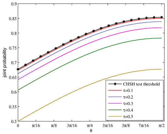 We first simulate the relationship between joint probability and choice of with different values of , as shown in Figure 2. It shows that the joint probability with imperfect sources is always lower than in the ideal case. Then, we can set the value of the black asterisk curve as the joint probability threshold P in the DI-QPQ protocol. By performing the CHSH local test on Bob’s side, the protocol can be implemented only when the prepared entanglement state is of a specific form. When the entanglement state is the other form, Bob will abort the protocol. Therefore, Bob can remove his trust in sources. The security of DI-QPQ protocol with imperfect sources is proved.