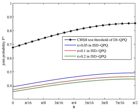 In order to analyze the ISD-QPQ protocol in a realistic detection model, we consider the detection loss rate . We maximize over the set of compatible probabilities using the first level of the hierarchy; the results of the numerical optimization are shown in Figure 3. When imperfect detectors are considered, the joint probability in the ISD-QPQ protocol is lower than in the previous DI-QPQ protocol. This is expected since imperfect detectors will induce detection loss. In addition, by using the SDP optimization method, we can obtain the CHSH test threshold of our ISD-QPQ protocol with fixed detection loss.