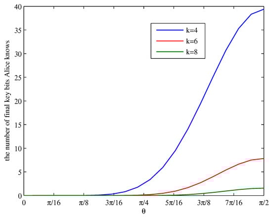 The relationship between the number of final key bits Alice knows and with different values of post-processing parameter k in ISD-QPQ protocol. The curve from top to bottom, respectively, represent . Assume the size of database is .