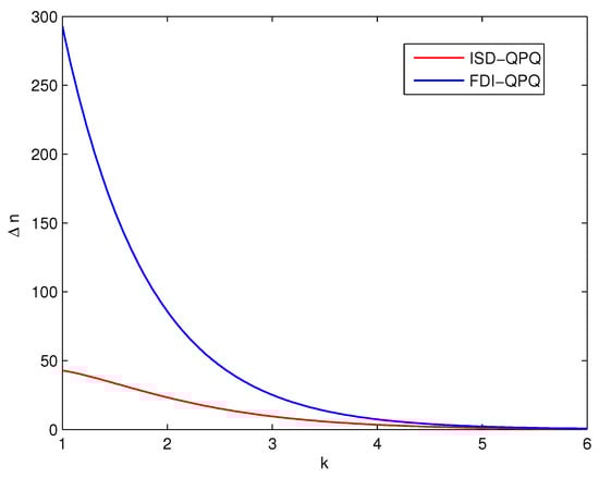 In addition, to characterize database security, we simulate the relationship between Alice’s extra bits and the post-processing parameter k when is fixed. The result is shown in Figure 6. We can see that when k increases, the extra bits known for Alice decrease. We choose the optimal k to ensure that is small enough. The larger k implies that more key bits are consumed. This indicates that the database of our protocol is secure. Compared with the FDI-QPQ protocol in [36], our ISD-QPQ protocol has better performance in terms of database security.