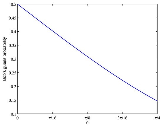 Furthermore, the different choice of in our QPQ protocol affects security. From Figure 4 and Figure 5, it can be clearly seen that as tends to , the probability of success guessing and the number of final key bits Alice knows gradually increases. With the increase in , the database security will decrease. From Figure 7, we can find that Bob’s guess probability gradually tends to 0.15 as tends to . We derive that when , Bob can obtain information on the conclusive results of Alice’s bits with an optimal probability. Therefore, the optimal choice of in our QPQ protocol is .