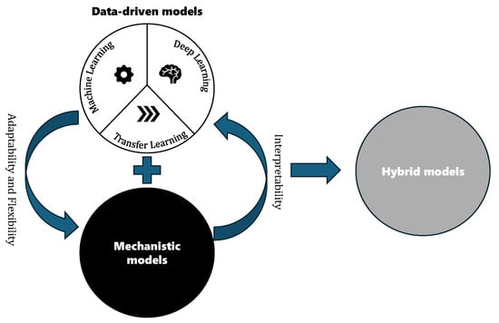 The idea of combining mechanistic modeling with data-driven models has emerged in the 1990s [,,]. Since then, a significant amount of research has been published using the term hybrid modeling in process engineering-related research fields and gray-box modeling in the control and automation fields. Advantages with respect to modeling complex, high-dimensional, and/or computationally expensive systems could greatly benefit from hybrid modeling techniques. Hybrid modeling methodologies are reviewed from the aspect of the structure or typology of hybrid models. The relation between mechanistic modeling and data-driven modeling is shown in Figure 2.