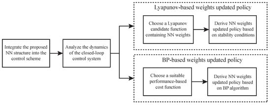 Owing to universal approximation, parallel distributed processing, hardware implementation, learning and adaptation, and multivariable systems [], neural networks are becoming particularly attractive and promising in control system design. Many neural networks with different structures have been introduced, like FFNNs [,,,,], radial basis function neural networks (RBFNNs) [,,,,,], RNNs [,,,], and CNNs [,]. The key or challenge of using a neural network for feedback control is to select a suitable control system structure and then demonstrate how the weights of neural networks can be tuned to ensure the control performances (including stability, robustness, dynamic performance, steady-state performance, etc.) of the developed closed-loop feedback systems. Some prevailing control approaches are reviewed in the following.