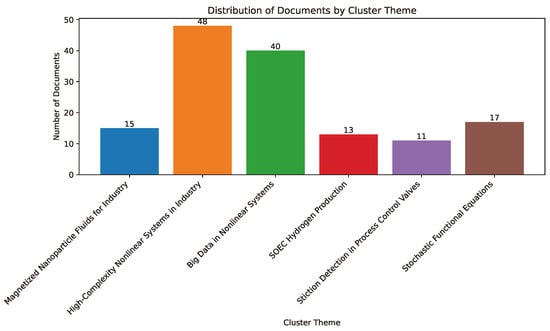 To address these questions, a comprehensive bibliographic search was conducted using Scopus and Web of Science, resulting in a dataset of 2628 articles from Scopus and 343 from WoS. After automated filtering using Python version 3.7 and the application of inclusion and exclusion criteria, 2900 consolidated references were obtained. From this dataset, 89 highly relevant studies were selected for in-depth analysis. A content analysis supported by k-means clustering grouped the literature into six major thematic areas, covering magnetohydrodynamics (MHD) and heat transfer with magnetized fluids [], nonlinear control in high-complexity systems, big data-driven optimization, energy transition through SOEC cells and hydrogen applications, fault detection in control valves (stiction), and stochastic models with semi-Markovian switching.