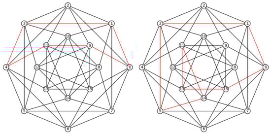 Figure 2. The Shrikhande graph G and two induced cycles of lengths 6 (left plot) and 8 (right plot), with their edges highlighted in red.