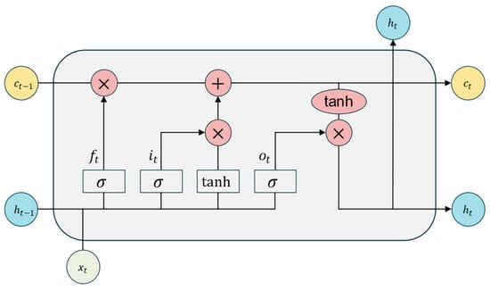Subsequently, the output from the CNN layer is passed to the LSTM layer to capture the forward and backward dependencies of the traffic sequence. The LSTM network controls the flow of information through four main gating mechanisms, namely, the forget gate , input gate , candidate cell state , and output gate , as shown in Figure 3. The computation process [25] is as follows: