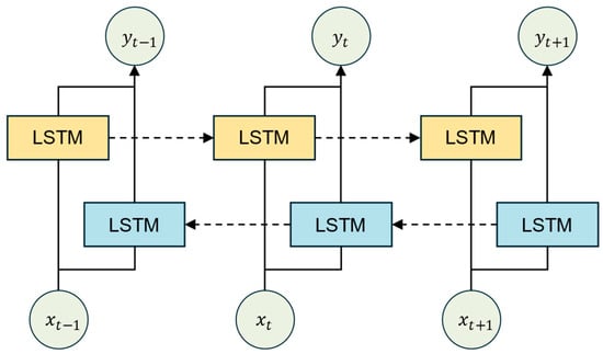 where represents the input, denotes the time step, is the sequence length, represents the output of the forward LSTM, is the output of the backward LSTM, and represents the concatenated output of the bidirectional LSTM.