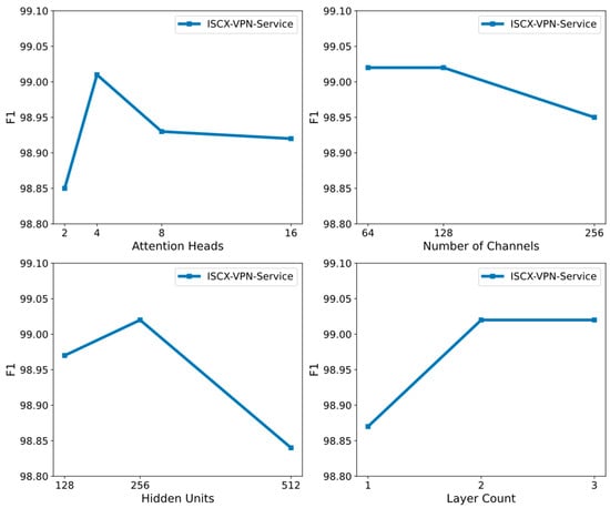 To investigate the impact of hyperparameters on model performance, we conducted multiple experiments on the ISCX-VPN-Service dataset, adjusting four key hyperparameters: the number of attention heads, the number of CNN channels, the number of BiLSTM hidden units, and the number of BiLSTM layers. The goal of these adjustments is to optimize the model’s performance in encrypted traffic classification tasks.