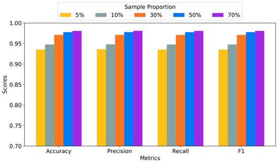 To validate the effectiveness and robustness of CLA-BERT in small-sample scenarios, we designed comparative experiments with different data proportions on the ISCX-VPN-Service dataset. The number of samples in each category was set to 1000, and random selections of 70%, 50%, 30%, 10%, and 5% of the samples were used for the small-sample experiments. This design allows us to systematically evaluate the performance changes in CLA-BERT as the data volume decreases.