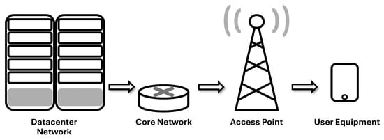 Modern distributed network architectures consist of the datacenter network, core network, access points (APs), and user equipment (UE), forming a hierarchical structure that ensures efficient data transmission and connectivity [16,17,18]. Figure 1 illustrates this architecture.