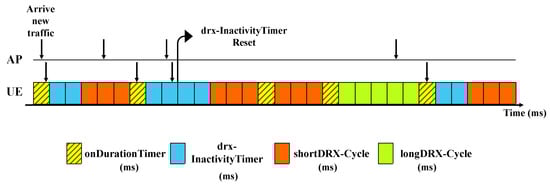 To mitigate this issue, discontinuous reception (DRX) technology was introduced as a power-saving mechanism that deactivates the receiver during idle periods, thereby reducing power consumption [7,8,9]. Particularly, connected-mode DRX (C-DRX) extends DRX functionality to the RRC_CONNECTED state, allowing UEs to periodically enter a sleep state to conserve energy [10].