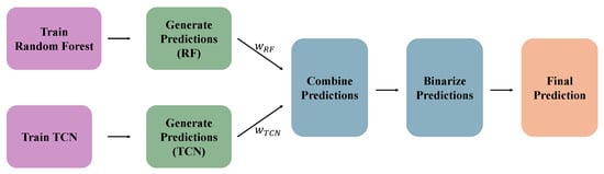 Proposed ensemble model structure. The random forest and TCN models are trained separately, and their outputs are combined using weighted averaging before binarization.