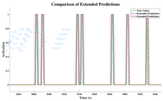 As shown in Figure 5, both the ensemble model and the extended activation approach closely align with actual traffic occurrences. The extended activation approach (red dashed line) further improves prediction accuracy by correcting minor temporal misalignments between predicted and actual traffic events.