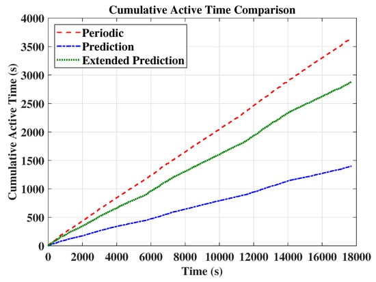 Figure 6 presents a comparison of cumulative active time across periodic, prediction-based, and extended prediction-based C-DRX approaches.