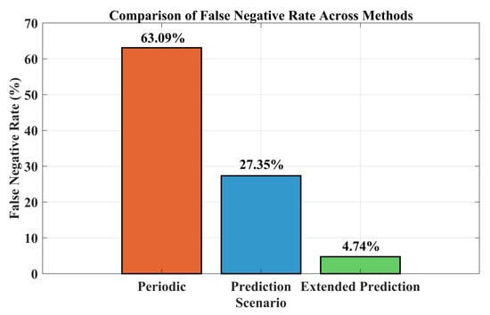 Periodic C-DRX exhibits the highest FN rate at 63.1%, as its fixed activation cycles frequently fail to detect incoming traffic. The prediction-based approach significantly reduces the FN rate by 56.6% (from 63.1% to 27.4%), while the extended prediction-based approach further lowers it by 92.6% (from 63.1% to 4.7%), ensuring more reliable traffic detection.