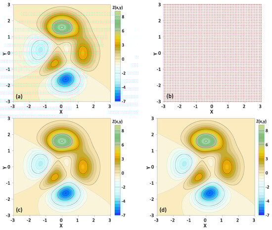 We designed one group of scattered data with 3271 (with 61 points evenly sampled with a 0.1 step length in both the x and y directions) discrete points to reconstruct the contour model defined by 361,201 nodes (with 601 points evenly sampled with a 0.01 step length in both the x and y directions). The details of the discrete points for the modeling test are indicated in Figure 4b.