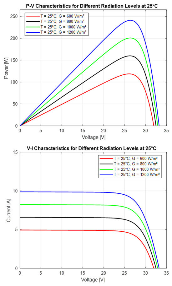 Figure 2 demonstrates the relationship between solar irradiance and the performance of the PV array, emphasizing key trends such as voltage, current, and power output across varying irradiance levels.