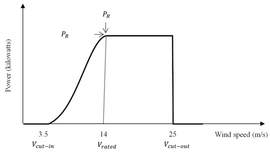 where is the rated power (kW); is the wind speed (m/s); and , , and denote the cut-in, rated, and cut-out wind speed (m/s) of the WT, respectively.