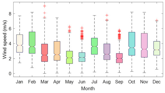 The output power of a WT generator is directly dependent on the wind speed at its hub height. In real-world applications, the location of the WT is of critical importance, as it must be positioned away from obstacles such as buildings, trees, or uneven terrain that could interfere with wind flow and adversely affect its performance. The wind speed can be estimated from the measured wind speed at the anemometer height using a power law [29,30,31]. The turbine’s power output is modeled as a piecewise function, with different equations governing wind speed intervals. When the wind speed reaches the cut-in speed, the turbine generates electricity. The wind density determines the output power, blade swept area, and efficiency coefficient. Once the rated speed is reached, the turbine produces its maximum rated power. If the wind speed exceeds the cut-out speed, then the turbine is shut down for safety. A mathematical representation of the wind speed profile using a power law is given in [32,33]:
