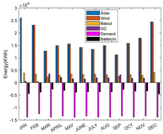 The energy contributions of wind, solar, diesel generator, and battery over a year are illustrated in Figure 15.