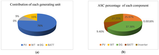 Figure 13 illustrates the power generation and investment percentages of different components within the hybrid energy system. The PV panels contributed 76% of the total power output, with an investment of 25.25%. The WT generated almost 0% of the power, requiring a 0% investment. The BSS and DGs contributed 15% and 9%, respectively, with investments of 9.40% and 37.38%.