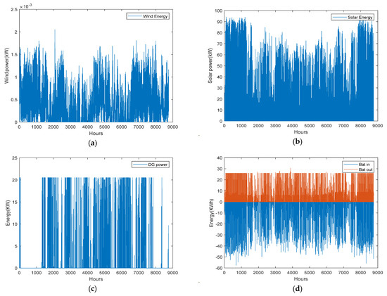 Energy contribution of each generating unit over a year: (a) wind; (b) solar; (c) diesel generator; (d) battery.
