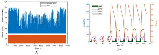 (a) Solar and wind power contribution to load demand; (b) energy balance and battery state of charge (SOC).