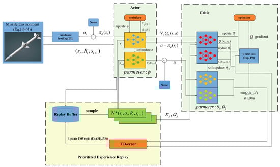 Sliding-mode variable structure control has the characteristics of high precision and strong robustness, so it is widely used in the design of guidance laws with constraints [14,15]. In [16,17,18], the authors use a terminal sliding-mode (TSM) control method to design the guidance law, which can guarantee that the impact angle converges to the expected impact angle and the line-of-sight (LOS) angle rate converges to zero in finite time, and they apply the finite-time control theory to solve the specific convergence time. However, the existing TSM and fast terminal sliding-mode (FTSM) controllers have a common shortcoming, that is, the singular problem occurs easily on the terminal sliding-mode surface when the error approaches zero. To solve this problem, NTSM was proposed. NTSM can not only achieve finite time convergence but also avoid singularity problems; references [19,20,21,22] verify the above theory. It should be pointed out that in [20,22], in order to eliminate chattering, a special function is used to replace the sign function, which introduces steady-state errors, and the guidance laws above are all for non-maneuvering targets. For maneuvering targets, the authors of [23] achieve impact angle convergence by selecting the missile’s lateral acceleration to enforce the terminal sliding mode on a switching surface designed using nonlinear engagement dynamics, but they do not take into account the singularity that the proposed design may exhibit in its implementation. A guidance law based on NTSM is proposed in [19], but the maneuvering upper limit of targets needs to be estimated, and there are chattering problems. In order to suppress high-frequency chattering, the boundary-layer method, reaching law method, and observer method are all effective solutions. The authors in [24] used continuous saturation function to approximate the sign function, which reduced the chattering, but this method led to a decrease in the robustness of the system as the boundary layer increased. To solve this problem, reference [25] designed a second-order sliding-mode guidance law with continuous characteristics based on the high-order sliding-mode algorithm. The super-twisting algorithm was adopted as the reaching law of the sliding-mode control to eliminate the discontinuous term in the guidance law and thus weaken the chattering. However, the traditional super-twisting algorithm has the shortcomings of a slow convergence speed when the system state is far from the equilibrium point and cannot make full use of the missile overload capacity [26]. Nowadays, with powerful nonlinear approximation and data representation methods, data-driven reinforcement learning(RL) methods have attracted considerable attention in the design of guidance law, and model-free RL has been implemented in several algorithms for finding optimal solutions, making complex decisions, and in self-learning systems which improve behavior based on previous experiences [27]. Traditional reinforcement learning methods are suited for discrete environments with small action and sample spaces. However, real-world tasks, such as guidance and control challenges, involve large state spaces and continuous action domains with complex, nonlinear dynamics, which conventional methods find difficult to manage. Deep reinforcement learning (DRL) addresses these limitations by integrating deep neural networks with reinforcement learning, thereby enabling a more robust approach to handling the complexities of continuous and nonlinear systems. In recent years, many authors [28,29,30,31,32] have used Q-learning, deep Q-leaning network (DQN), deep deterministic policy gradient (DDPG), twin-delayed deep deterministic policy gradient (TD3), and other RL algorithms to train neural network models. The parameters of the missile’s LOS rate, position vector, and so on are used as state variables in a Markov decision as inputs, then the trained neural network can directly map the guidance command, which provides a new idea for the design of guidance law under multi-constraint conditions. Gaudet et al. [33] improved the Proximal Policy Optimization (PPO) algorithm and proposed a three-dimensional guidance law design framework based on DRL for interceptors trained with the PPO algorithm. A comparative analysis showed that the deduced guidance law also had better performance and efficiency than the extended Zero-Effort-Miss (ZEM) policy. In a similar way, Gaudet et al. [34] developed a new adaptive guidance system using reinforcement meta-learning with a recursive strategy and a value function approximator to complete the safe landing of an agent on an asteroid with unknown environmental dynamics. This is also a good method to solve the continuous control problem, but the PPO algorithm uses a random policy to explore and exploit rewards, and this method to estimate the accurate gradient requires a large number of random actions to find the accurate gradient. Therefore, such random operation reduces the algorithm’s convergence speed. In [35], an adaptive neuro-fuzzy inference sliding-mode control (ANFSMC) guidance law with impact angle constraint is proposed by combining the sliding-mode control method with an adaptive neuro-fuzzy inference system (ANFIS), and the ANFIS is introduced to adaptively update the additional control command and reduce the high-frequency chatter of the sliding-mode control (SMC), which enhances the robustness and reduces the chattering of the system; numerical simulations also verify the effectiveness of the proposed guidance law. In [36], the author proposes a three-dimensional (3D) intelligent impact-time control guidance (ITCG) law based on nonlinear relative motion relationship with the field of view (FOV) strictly constrained. By feeding back the FOV error, the modified time bias term including a guidance gain which can accelerate the convergence rate is incorporated into 3D-PNG; then, the guidance gain is obtained by DDPG in th