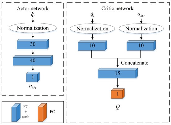 The deep reinforcement learning algorithm is an algorithm based on the actor–critic network structure, which can update policy and value function at the same time and is suitable for solving decision problems in the continuous task space. Using the DDPG [45] algorithm as an example, the actor network uses policy functions to generate action , which is executed by agents to interact with the environment. The critic network uses the state-action value function to evaluate the performance of the action and instruct the actor network to choose a better action for the next stage.
