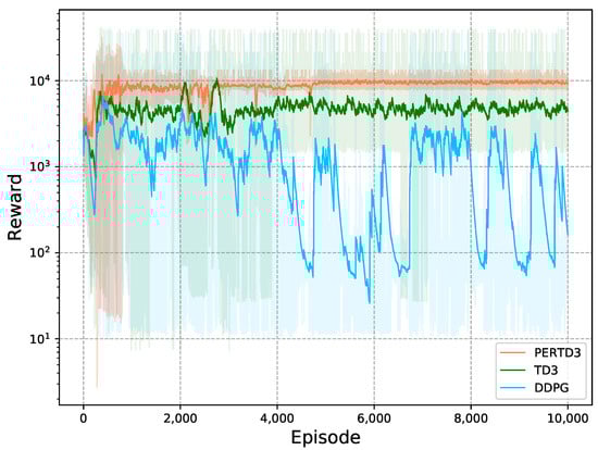 where , are the Q values generated by the two critic target networks, respectively, and represents the next state. When updating the policy, because the actor network module selects the maximum Q value in the current state, Equation (48) can effectively reduce the overestimation error. Then, we take the above equation and calculate the mean squared error (MSE) of the values generated by the two critic networks, and we can obtain the loss function of the critic network.