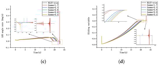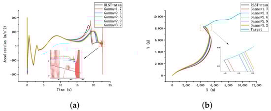 While the traditional super-twisting method directly sets the parameter to 2, we introduced a free parameter γ in Equation (28). Various papers [26,52,53,54,55,56,57] have proposed different adaptive methods to improve the super-twisting sliding-mode guidance law, each with its own specific form. However, most of these methods involve an adaptive gain adjustment of the parameter . The study [50] already showed that for the traditional super-twisting algorithm, as long as was sufficiently large, the algorithm could converge. As for the impact of parameter variation involved in the equation on control effectiveness, there is currently no literature studying this aspect, with only a few references (e.g., [58]) mentioning choosing a value slightly greater than 0.5 for . This suggests that some researchers may have already found that directly selecting the value as may not be appropriate. Therefore, this paper employed DRL algorithms to adaptively adjust the selection of this parameter through model-free learning to achieve adaptive tuning.