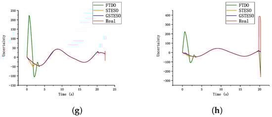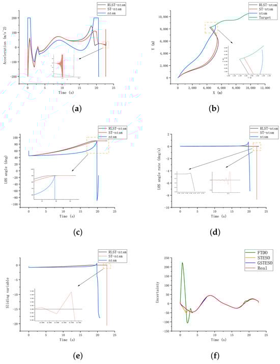 Comparison for three guidance law and three observer under case 2: (a) missile acceleration commands; (b) trajectories of missile and target; (c) LOS angle; (d) LOS angular rate; (e) sliding-variable profiles; (f) three observers’ estimation in RLST-NTSM. (g) three observers’ estimation in ST-NTSM; (h) three observers’ estimation in NTSM.