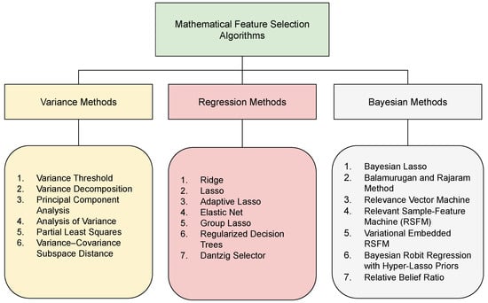 Mathematical approaches to feature selection can be broadly categorized according to the underlying theoretical frameworks used to rank or eliminate predictors. In particular, three families of methods have been extensively studied in the literature: variance-based, regularization-based, and Bayesian methods (Figure 1). These approaches have distinct mathematical formulations but share a common objective of identifying informative features to improve model accuracy, interpretability, and computational efficiency. In this section, we provide an overview of these principal mathematical frameworks, serving as a roadmap for the subsequent sections of this paper.