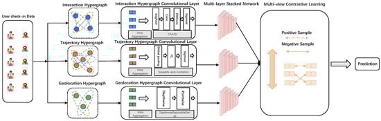 In the next POI recommendation, complex relationships exist between users and POIs, such as user–POI interactions, POI–POI trajectory relationships, and POI–POI location relationships. The previous methods typically used graphs to represent these relationships, where users and POIs are treated as nodes, and their relationships are modeled as edges [26,27]. However, traditional graph structures are limited to pairwise relationships and cannot effectively connect higher-order neighbors within the same semantic context. Inspired by the highly flexible structure of hypergraphs, we innovatively designed three distinct types of hypergraphs: the interaction view hypergraph, the trajectory view hypergraph, and the geographical view hypergraph.
