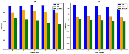 The experimental results show that when the learning rate is set to 0.01, MVHGAT performs best in Recall@10 and NDCG@10 on the NYC and TKY datasets. This indicates that a moderate learning rate helps the model converge better during training and effectively capture high-order collaborative signals. A smaller learning rate (e.g., 0.001) results in slow convergence during training, preventing the model from reaching optimal performance. Conversely, a more significant learning rate (e.g., 0.1) causes unstable training, with significant fluctuations during the convergence process, ultimately leading to performance degradation.