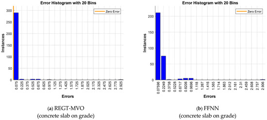 Figure 4a,b show the error histograms for REGT-MTBO and SVM of cast-in-place concrete tunnel liners. It is worth mentioning that the error values are clustered into 20 bins and the orange line denotes zero error. As can be seen, the most frequent error of REGT-MTBO is 0.075, and it is 0.1691 for SVM. Similarly, the error histograms of deterioration models of the concrete cross passageway are displayed in Figure 4c,d. It is clear that the majority of the error values are close to 0 and 0.1174 for REGT-MVO and SVM, respectively. Figure 5a,b illustrate the error histograms of deterioration models of concrete interior walls. It is indicated that the most repeated error values of REGT-DA and SVM are 0.075 and 0.1042, respectively. Figure 5c,d reflect the resulting error histograms for concrete portals. It is manifested that almost 95% of the testing instances of REGT-MTBO accommodate errors less than 0.05. For the FFNN, the most frequent error values are 0.05034 and 0.1505. Figure 6a,b exemplify the error distributions of REGT-MVO and FFNN in concrete slab on grade. It is conceived that 91% of the error values of REGT-MVO are smaller than 0.075. Moreover, the most repeated error values of FFNN are 0.07596 and 0.2249. The error distributions of REGT-DE and FFNN can be seen in Figure 6c,d (gaskets). It can be viewed that the most common error value of REGT-DE is 0.025, while the error values of FFNN generally span from 0.03668 to 0.6704.