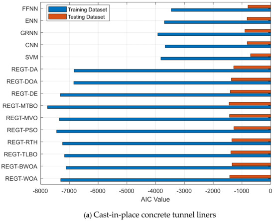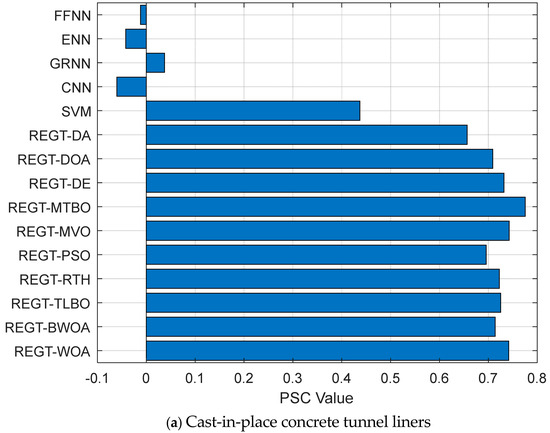Table 3 depicts the results of the deterioration models of cast-in-place concrete tunnel liners and concrete cross passageways. In cast-in-place concrete tunnel lines, it is shown that REGT-MTBO is the best predictive model (MAE = 0.037, MAPE = 1.893%, RMSPE = 10.027%, RMSE-0.192, NRMSE = 0.203, and U95 = 0.57). It is also shown that REGT-MVO has the second lowest MAE (0.038), MAPE (2.209%), and RMSE (0.195). In the same vein, REGT-WOA achieved the second lowest values of RSMPE (10.948%) and U95 (0.572). Out of all models, SVM produced the highest MAE (0.194), MAPE (15.763%), RMSE (0.44), and U95 (0.972). As for concrete cross passageways, it is observed that the REGT-MVO provides the best performance with MAE, MAPE, RMSPE, RMSE, NRMSE, and U95 of 0.149, 10.173%, 26.077%, 0.386, 0.268 and 1, respectively. In addition, REGT-TLBO comes in the second place attaining the second lowest values of MAE (0.189), MAPE (13.528%), and RMSE (0.435). On the other hand, CNN achieved the lowest accuracies with MAE, MAPE, RMSPE, RMSE, NRMSE and U95 values of 0.534, 43.865%, 52.017%, 0.731, 0.467, and 1.585, respectively.