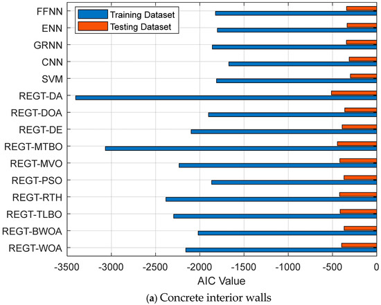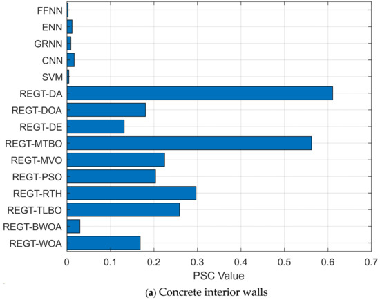 The results of the deterioration models of concrete interior walls and concrete portals are summarized in Table 4. In concrete interior walls, it is noted that REGT-DA provides the highest prediction accuracies (MAE = 0.092, MAPE = 5.604%, RMSPE = 17.507%, RMSE = 0.303, NRMSE = 0.301, and U95 = 0.867). In contrast, SVM performed poorly with MAE, MAPE, RMSPE, RMSE, NRMSE and U95 values of 0.234, 18.495%, 23.923%, 0.484, 0.349, and 1.126, respectively. In relation to concrete portals, the results clarify that REGT-MVO and REGT-MTBO exhibit a better performance than the remaining models (MAE = 0.02, MAPE = 1.151%, RMSPE = 8.374%, RMSE = 0.14, NRMSE = 0.134, and U95 = 0.393). On the other hand, SVM is the least effective model such that it exhibited MAE, MAPE, RMPSE, RMSE, NRMSE, and U95 values of 0.196, 16.261%, 17.464%, 0.443, 0.264, and 0.96, respectively.